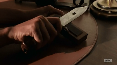 Secondly, we see Sasha brooding as she sharpens a small hunting knife. Oddly enough, she pushes the cutting edge of the blade against the sharpening stone instead of pulling it toward her (in the photo above, she's moving it toward the right).